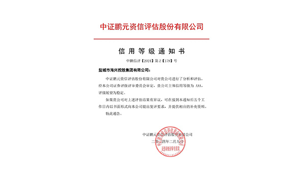 2月9日,中證鵬元資信評估股份有限公司發(fā)布《信用等級通知書》中鵬信評【2024】第Z【179】號,確定鹽城市海興控股集團(tuán)有限公司主體信用等級為 AAA,評級展望為穩(wěn)定。2024-02-09 -