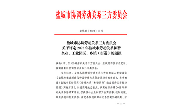 近日,鹽城市協(xié)調(diào)勞動(dòng)關(guān)系三方委員會(huì)按照《關(guān)于開(kāi)展 2023 年勞動(dòng)關(guān)系和諧培育活動(dòng)的通知》的工作部署,經(jīng)各地協(xié)調(diào)勞動(dòng)關(guān)系三方委員會(huì)培育、驗(yàn)收、推薦,市協(xié)調(diào)勞動(dòng)關(guān)系三方委員會(huì)研究決定,評(píng)定鹽城市灌東經(jīng)濟(jì)開(kāi)發(fā)投資有限公司為 2023 年鹽城市勞動(dòng)關(guān)系和諧企業(yè)之一。2024-01-08 -